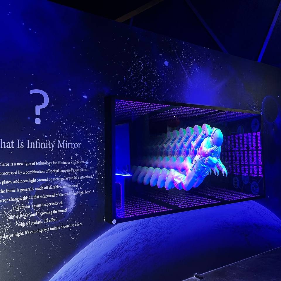 Infinity Mirror is a new type of technology for luminous characters. It is mainly processed by a combination of special tempered glass panels, Chevron bottom plates, and neon light; round or rectangular can be customized, and the frame is generally made off durable stainless steel.