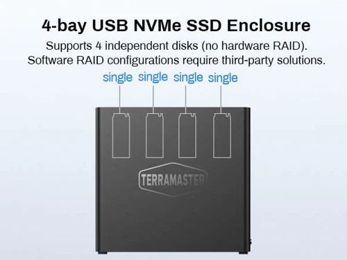 Ultra-Fast 40Gbps Speeds for Demanding Workflows: The D4 SSD NVMe enclosure delivers 40Gbps speeds, and it’s compatible with Thunderbolt 5/4/3, USB 4/3.2/3.1/3.0/2.0. It delivers speeds up to 3,224MB/s with 4x 990 PRO SSDs, or 1,608MB/s with a single SSD, ideal for 4K video editing and large file transfers. Note: No built-in RAID; supports four individual disks (soft RAID via third-party tools). Note: This device lacks built-in RAID but supports up to 4 independent drives. For RAID, use third-party software and connect via USB4/Thunderbolt.