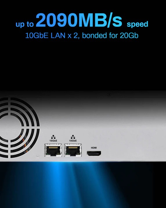 20Gb Lightning-Fast Throughput: The U8-500 Plus NAS server features dual 10GbE Ethernet ports, offering up to 20Gbps bandwidth. With SMB multichannel support, it achieves up to 2090MB/s sequential write speeds and 450MB/s 4K random read/write speeds. This performance ensures seamless image and video handling, making it perfect for film production, post-production, and high-demand virtualized environments.